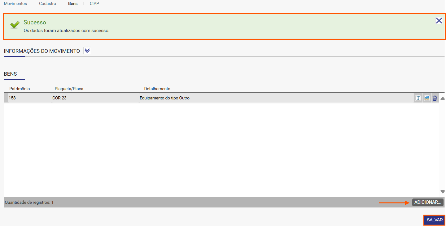 3. Acesse a aba Bens e clique em Adicionar para selecionar os bens que serão baixados. Após a seleção, salve as informações: