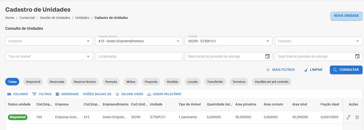 1. Acesse Comercial / Gestão de Unidades / Unidades / Cadastro de Unidade, e consulte pela unidade em questão. Ex: