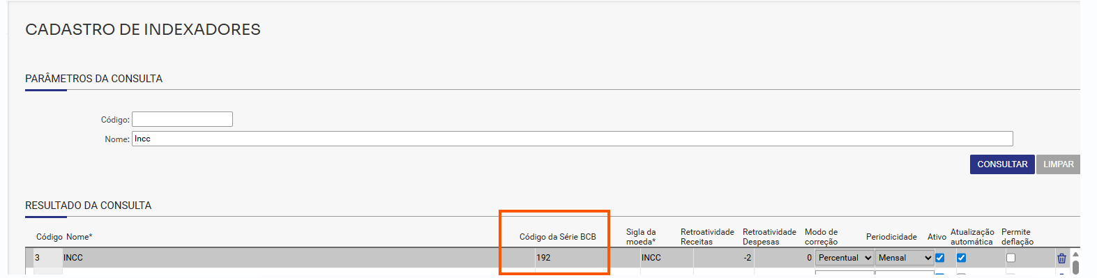 Atenção! Na rotina de cadastro de Indexador, precisa preencher o campo Código da Série BCB, para que no momento da importação do indexador, o sistema faça a importação corretamente dos valores. Os códigos das séries podem ser obtidos no site do Banco Central do Brasil, digitando o nome da série no campo "Pesquisa textual (nome da série)". Acesse o site clicando Aqui.