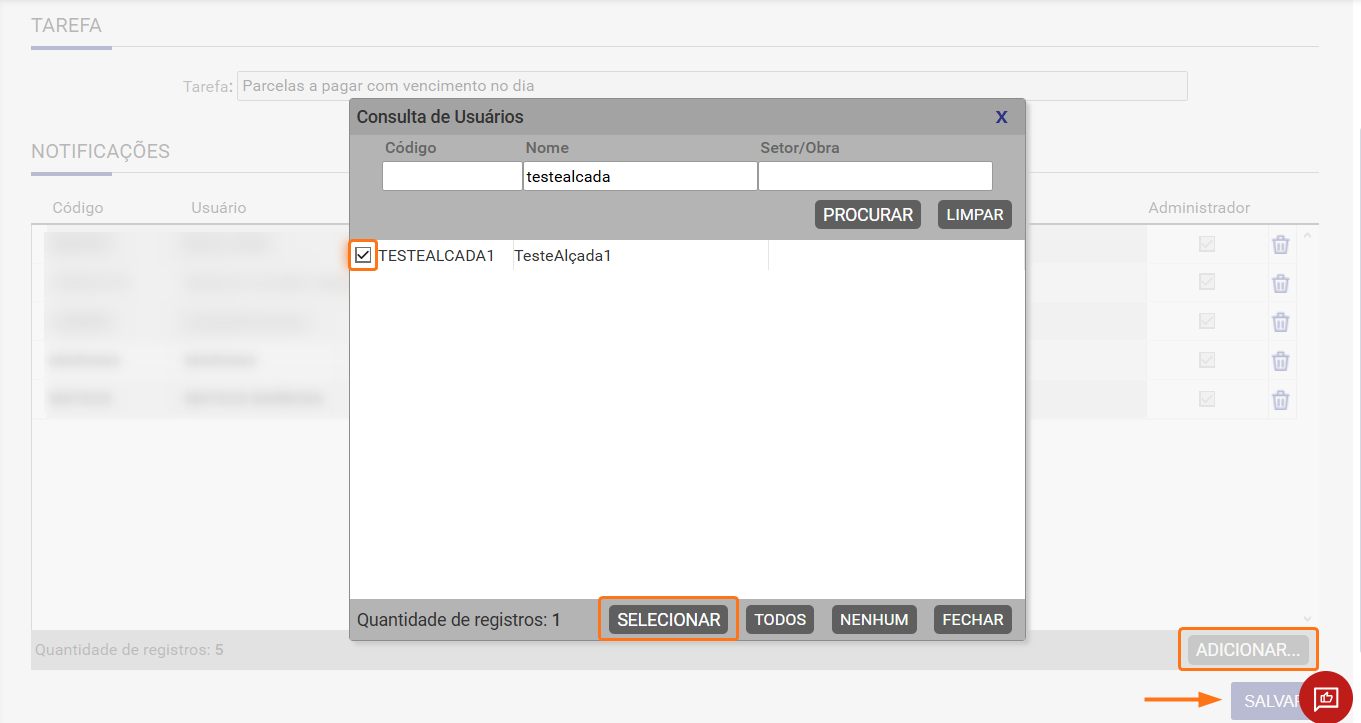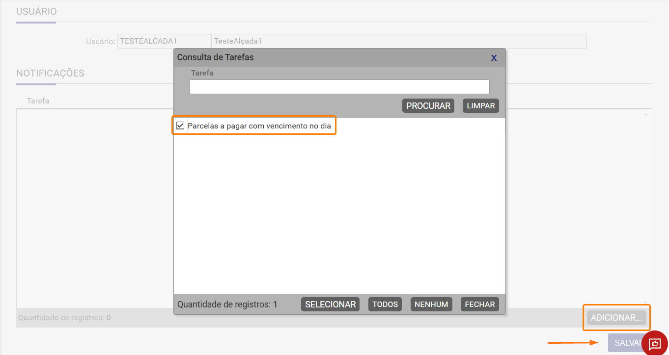 2. Consulte pelo nome ou código do usuário e abra a tela de edição. Adicione a tarefa "Parcelas a pagar com vencimento no dia" e salve a tela.