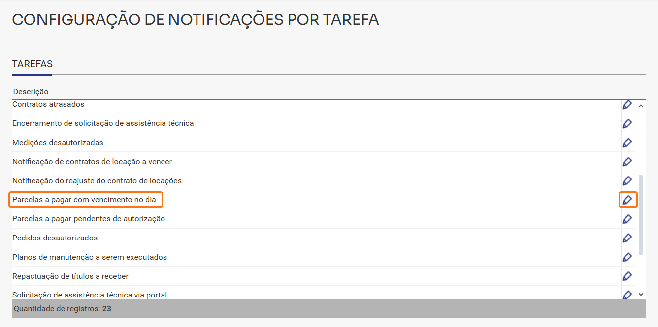 1. Acesse: Segurança / Administração / Mural de Avisos / Tarefas e marque a flag "Ativo" para a tarefa "Parcelas a pagar com vencimento no dia" e depois clicar em "Salvar".