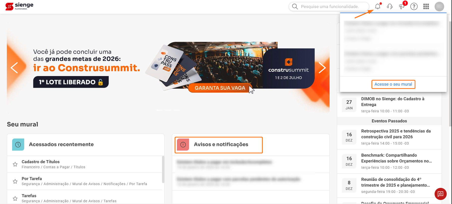 Após isso, o usuário será notificado com parcelas com vencimento no dia na tela principal do Sienge. É possível também, no topo da tela selecionando o ícone de sino para validar novos avisos, notificações e acessar o mural.