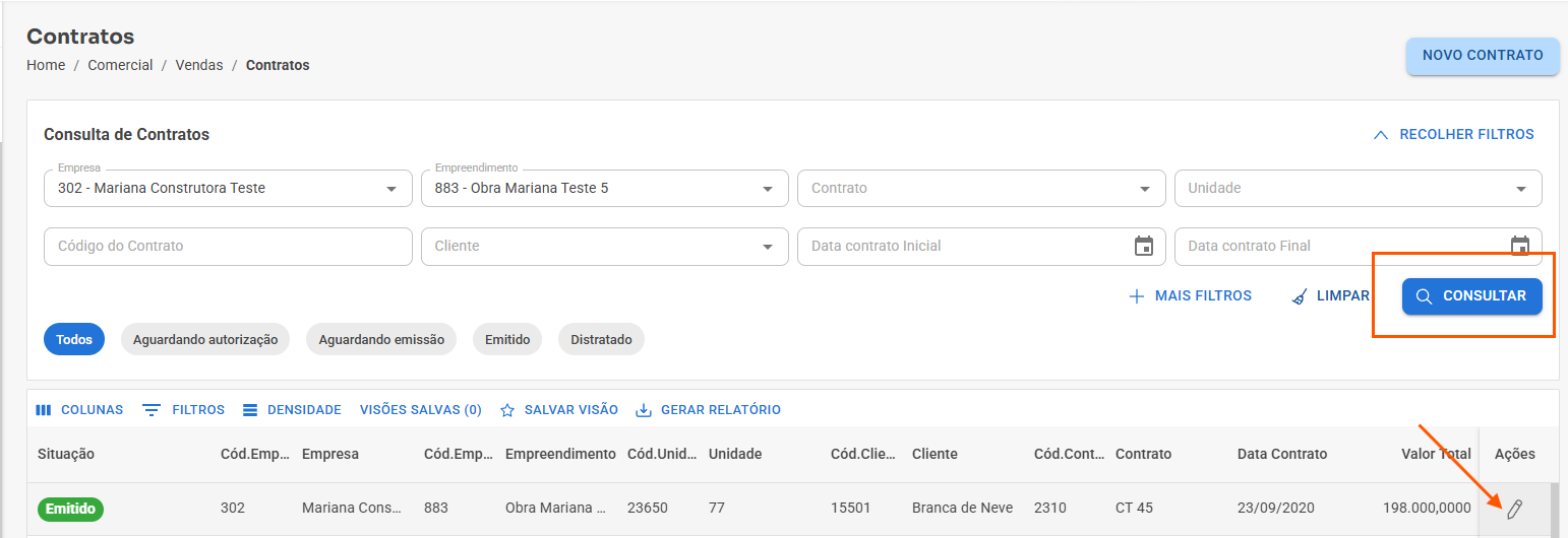 1) Acessar Comercial / Vendas / Contratos / Contratos, consultar o contrato e editar