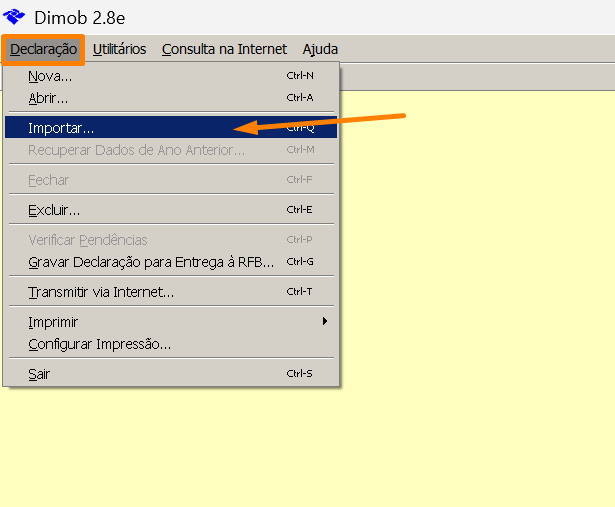 1- Após gerar o arquivo no formato de texto (.txt) pelo Sienge em Contabilidade/Fiscal / Obrigações Fiscais / Declarações / DIMOB, para enviar o arquivo será preciso entrar no software da Dimob, clicar em Declaração/Importar: