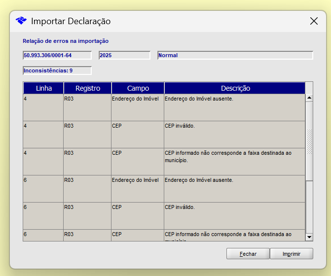 Atenção! Caso tenha alguma inconsistência, como por exemplo, dados do endereço do imóvel ausente, estes erros deverão ser ajustados no sistema, deverá gerar um novo arquivo e refazer a importação, exemplo: