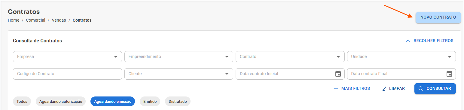 1. Em Comercial / Vendas / Contratos / Contratos, poderá cadastrar um novo contrato de venda:
