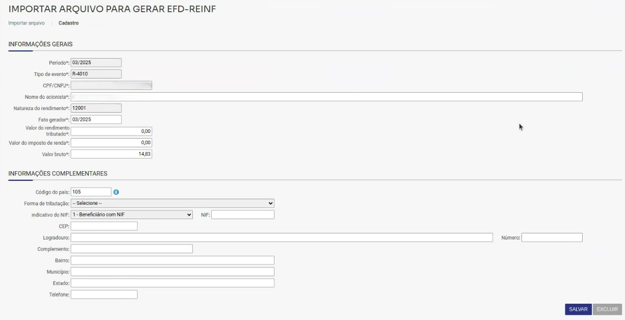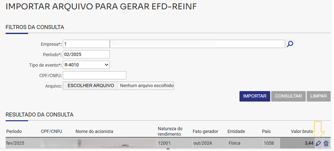 É permitida a edição de algumas informações da importação, acessando em: Contabilidade/Fiscal > Obrigações fiscais > SPED > EFD-Reinf > Importação.