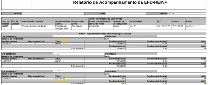 Para o caso de dados vindos da importação, na coluna “Título”, para apresentar a origem dos eventos gerados na grid dos eventos da série R-4010 e R-4020, estará detalhado “Importação”.
