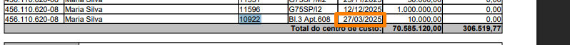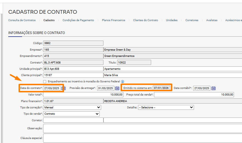 Este contrato será considerado na Dimob conforme a Data do contrato, que é 27/03/2025 e não a data que foi emitido no sistema:
